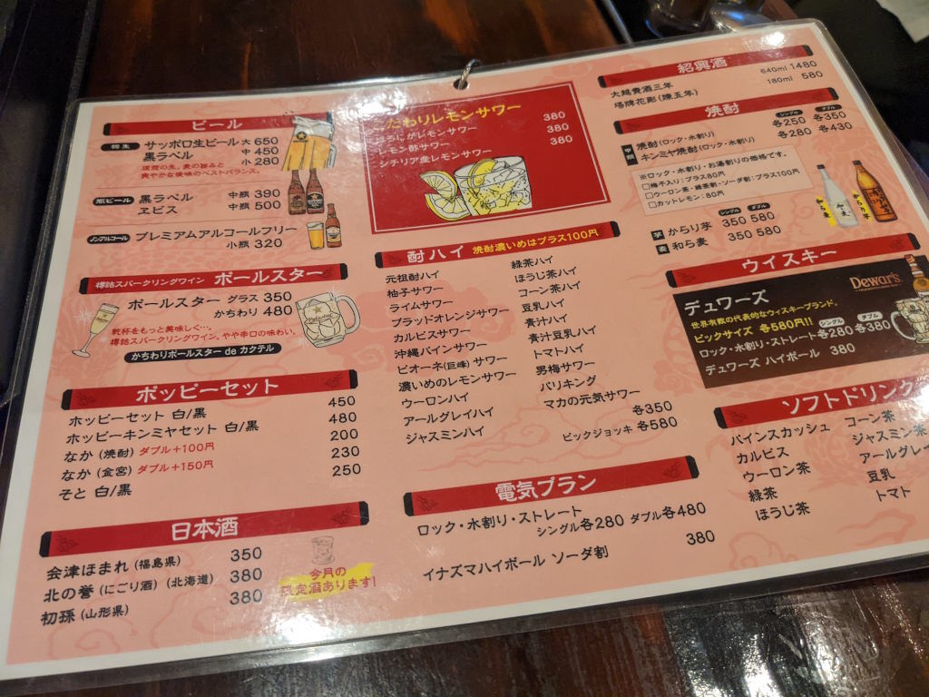 中華酒場 風来坊の飲み物はオーソドックスな印象。とりあえず、チューハイをお願いしてみた。