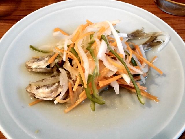 レギュラーメニューの他にも、その日限定っぽいデリも何品か用意されていて、250円からオーダーできる。この手軽な感じは他のお店ではあまり見かけないし、個人的にはいいなと思った。というわけで、デリの中から「子あじのエスカベッシュ」をオーダーしてみた。小さいアジは丁寧に揚げられているせいか、骨は当たらないし、酢の塩梅がちょうど良く、酸っぱすぎないけれど、きっちり酢が利いているのがいい。