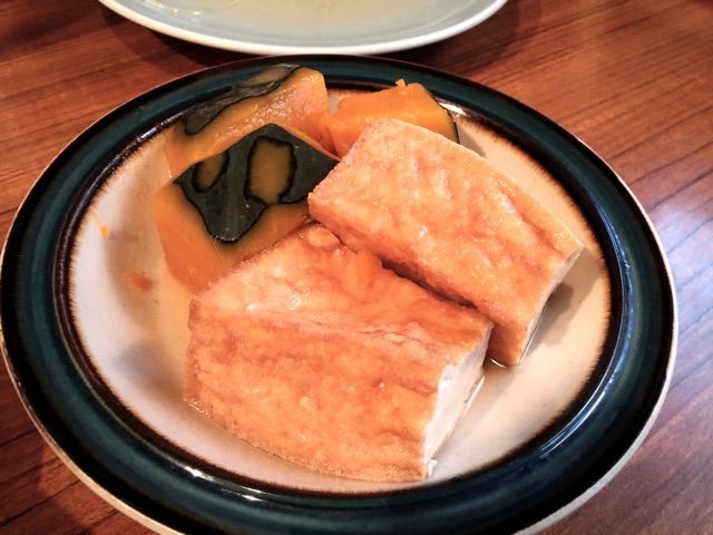 「子あじのエスカベッシュ」を食べていたら、うっかり食欲が出てきてしまい、調子に乗って「鶏の唐揚げ」を単品で頼んでみた。唐揚げを揚げているのを待っている間に、もう1品何か…と思って悩んでいたら、オススメされたのが「厚揚げとカボチャの煮物」。オススメされただけあって、しつこくない、あっさりとした味付けなので、さくさく食べられた。旨い。